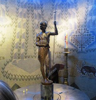 O batistério é da autoria de José de Almada Negreiros, os vitrais, os mosaicos, as pinturas, o gradeamento de ferro (da autoria de Júlio Ferry Borges) com figurações de água (purificação) peixes (ícone dos cristãos), árvores (árvore da vida) É constituído por um corpo de planta circular, no centro a pia batismal com a estátua de S. João Batista de Leopoldo de Almeida.
